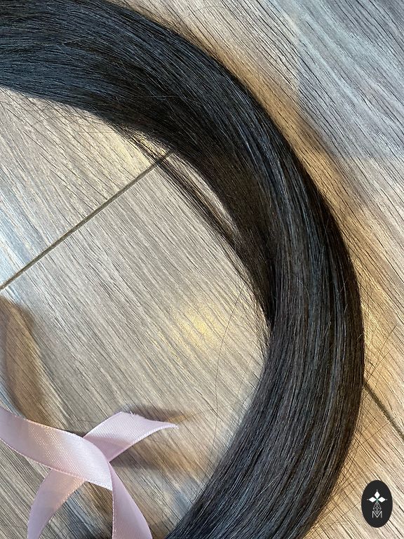 Looduslikud MellaHair juuksed, 3 pikkuses - 50 cm pikim-enamus, 35 cm ja 30 cm veidi, mõeldud lõike korrigeerimiseks. Kokku 177 g. Varem kasutatud tape-in ja kapsli pikendustes. Vajalik eemaldamine/ümbertöötlemine (liim, kapslid) enne taaskasutamist. Juuste kvaliteet väga hea. Pehmed, ei lähe sassi. Kantud 3-4 kuud. Toon - segu pruun+must.