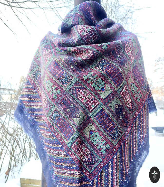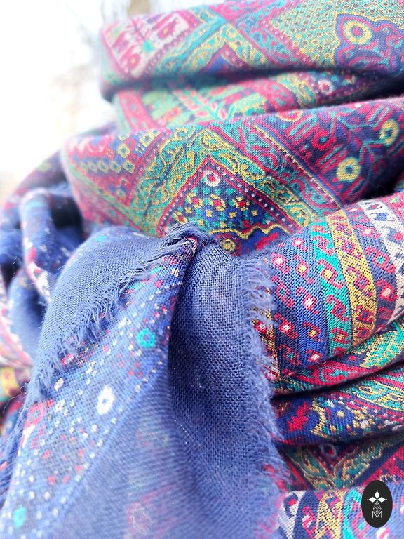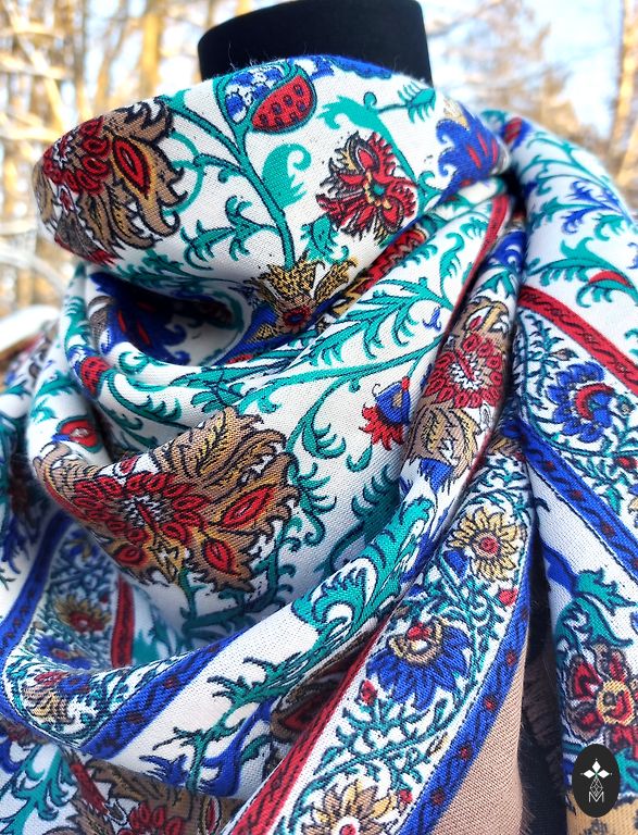 Siuvinėtas smėlio spalvos skara su gėlėmis ir kutais, šifonas.
