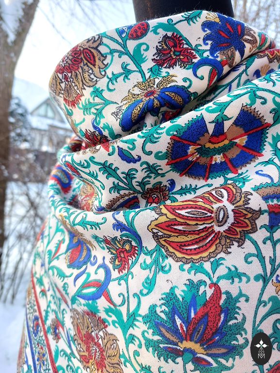 Pastelinė smėlio spalva su siuvinėjimais ir ilgomis kutais, pusiau permatoma su siuvinėtais žiedeliais. Klasikinis, minimalizmo stilius.