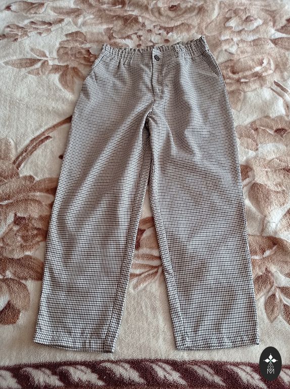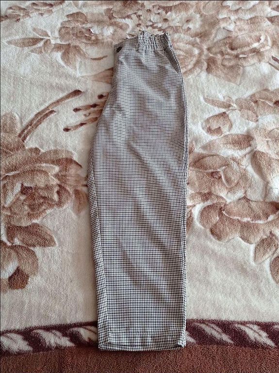 98% poliesteris, 2% elastanas, juosmu 96 cm ir tampri, ilgis 104 cm, juosmenyje odinis raištis, taip pat prie kišenių oda su užtrauktuku. Šiltos, labai gražios kelnės.