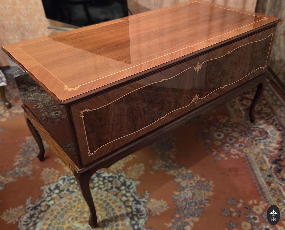 Stalas yra ištraukiamas iš šonų, tačiau, deja, plokštės neišliko.