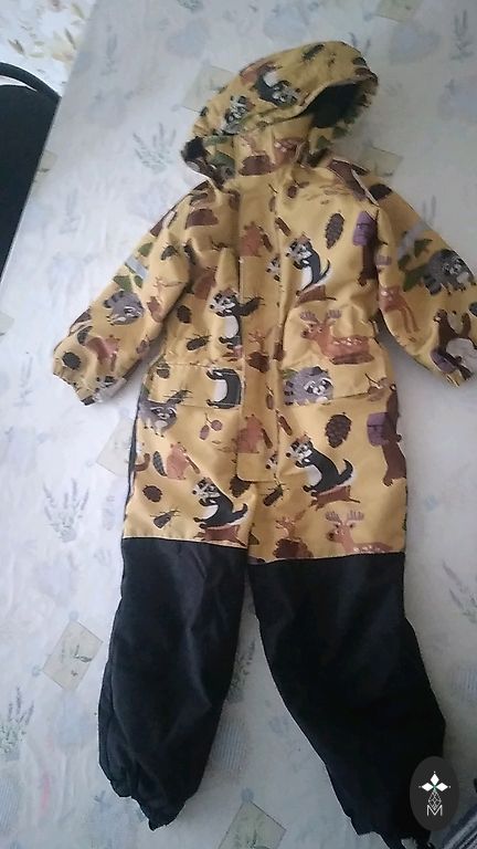 Двухчастный комбинезон Ленне, брюки темно-коричневого цвета без резинок на концах штанин, колени немного потертые, но без дыр. Могу дать в комплекте темно-синие брюки другой фирмы того же размера. Комбинезон милый, подойдет на длительное время.