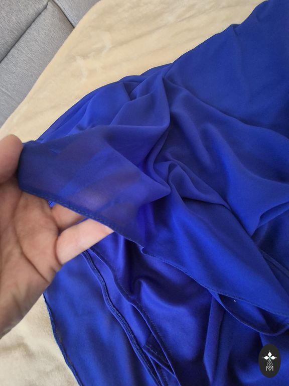 Audinys elastingas, suknelė turi pamušalą, nugaroje trikampio formos iškirptė kaip priekyje ir užtrauktukas.
