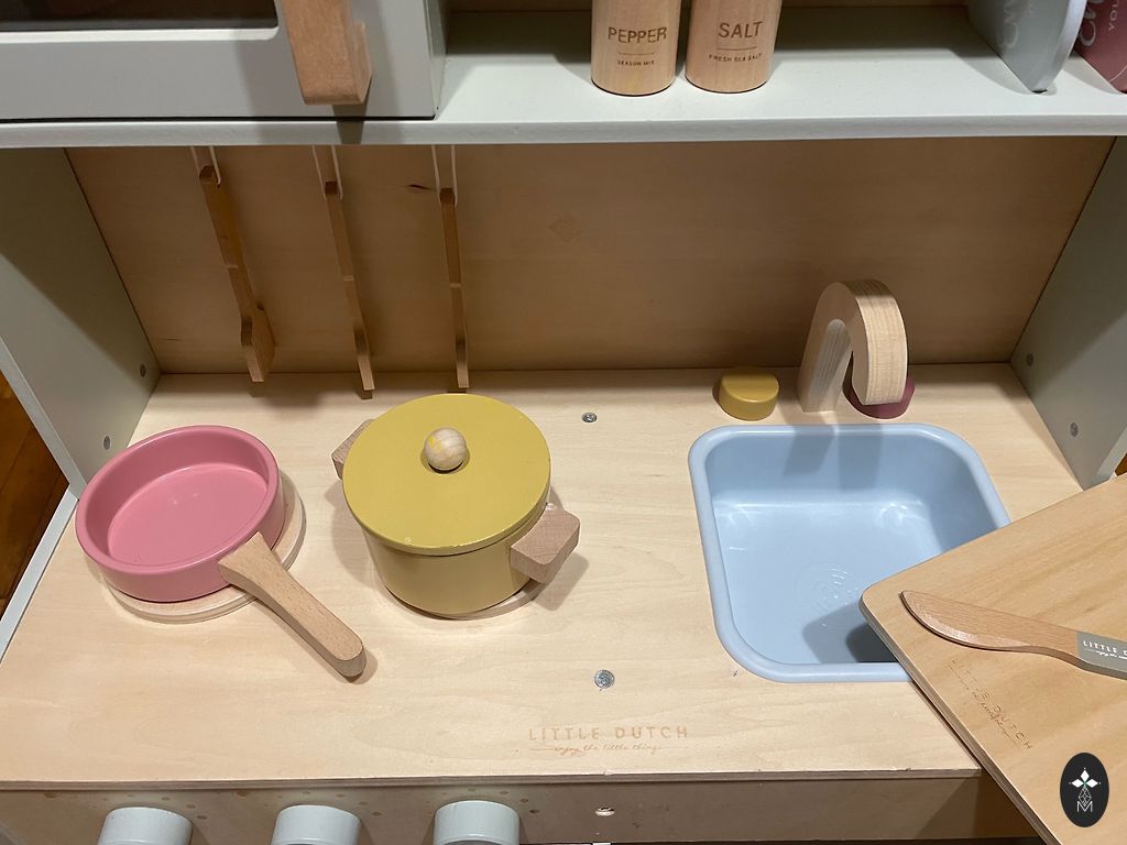 Ir lietošanas pazīmes,bet tāpat lieliskā stāvoklī.Vienīgi katliņam,pannai un krūzītēm ir noberzusies krāsa un var redzēt ka aktīvi spēlēts ar viņiem.Bildē redzams ka lejā vienā vietiņā ir minimāli ieplisis jeb ielocijies koks,bet viņu noteikti var sataisit un nekada ziņā netraucē lietošanai.