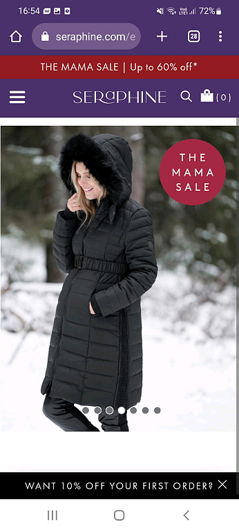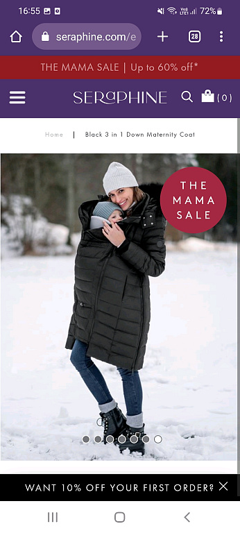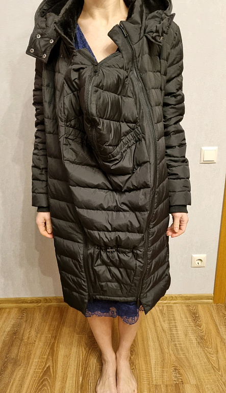 Warm winter coat for pregnant women (composition: 80% down, 20% feathers). There are zippers on the sides that can expand the coat's circumference. It has a belt, so it can also be worn after pregnancy as a regular coat. Additionally, there is an insert panel to wear the coat while carrying a baby in a sling.