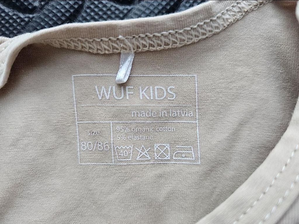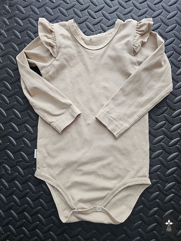 Sudėtis: 65% medvilnės, 35% poliesterio. Malonus odai. Petnešos raišteliai, todėl tinka įvairaus amžiaus vaikams, tačiau nurodytas dydis yra ~8 mėnesiai. Mažai dėvėtas, tik fotosesijai.