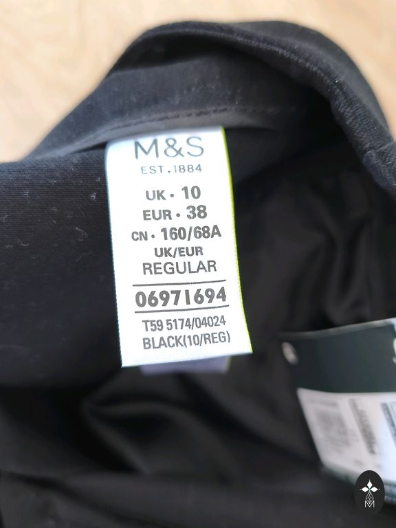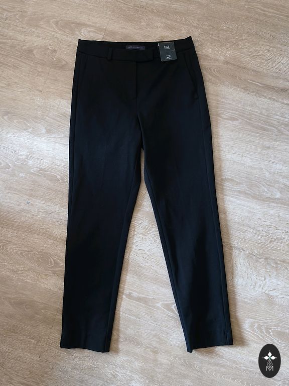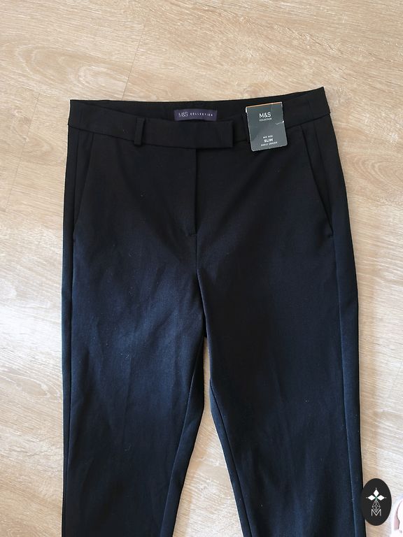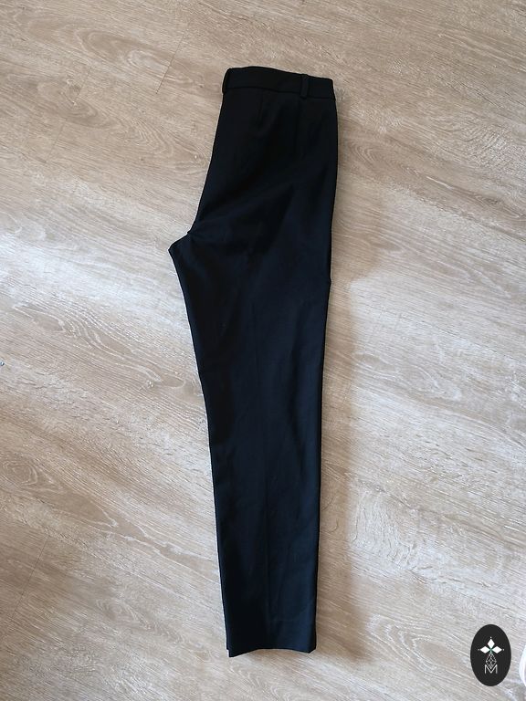 Krentančios kelnės su siūlėmis priekyje, aukštas juosmuo gali būti atlenktas, jei norite, 38 cm, tempiasi. Minkštos, tamprios, dydis nurodytas S, bet labiau atitinka M. Šoninė kraštinė 112 cm, įskaitant juosmenį 8 cm. Vidinė siūlė 82 cm. Kojos plotis 30 cm. Plazdančios, minkštos medžiagos, vidutinio storio.