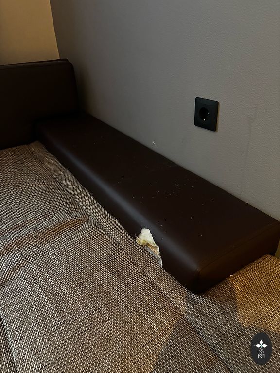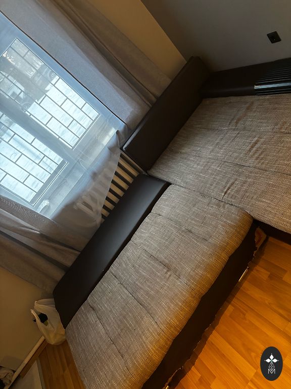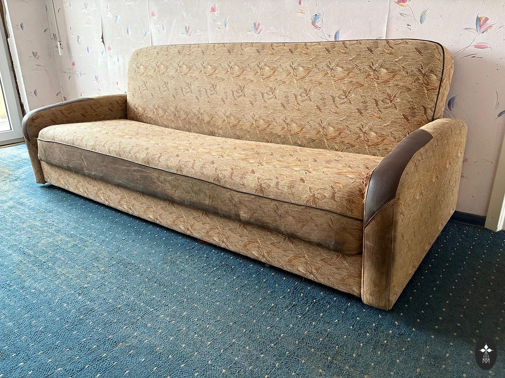 Lietos dīvāns.Pašizvešana. Nav kāju. Gulēšanai nav diez ko ērts. Vairāk der sēdēšanai.