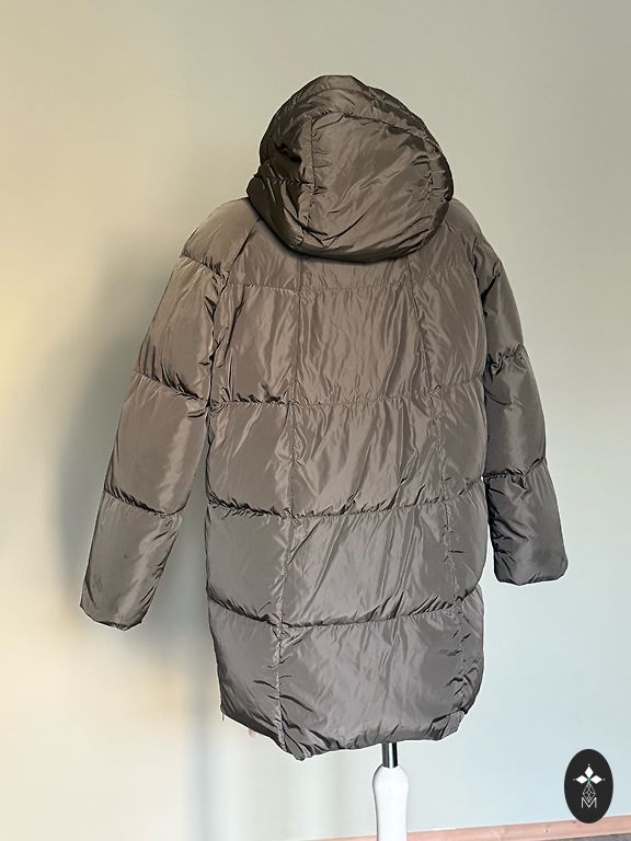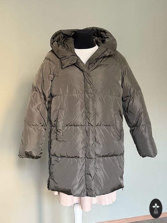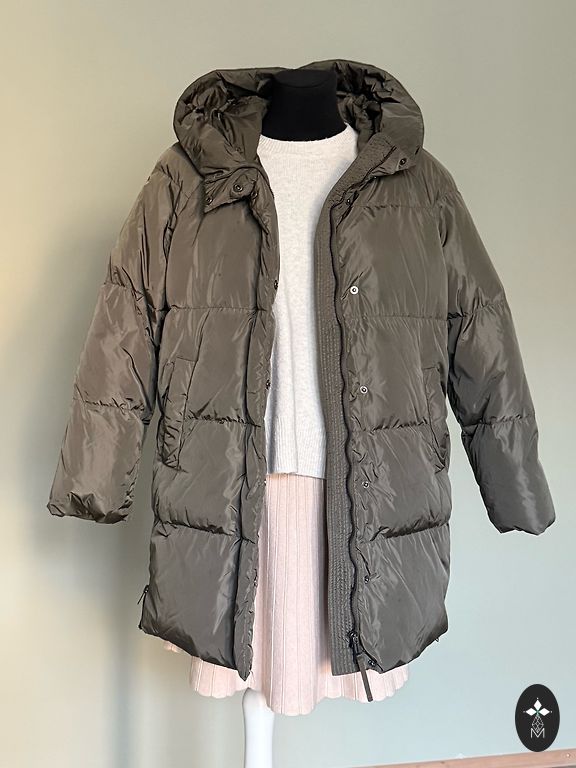 Skaists, silts mētelis ar poliestera pildījumu, mazletots. Garums 110 cm