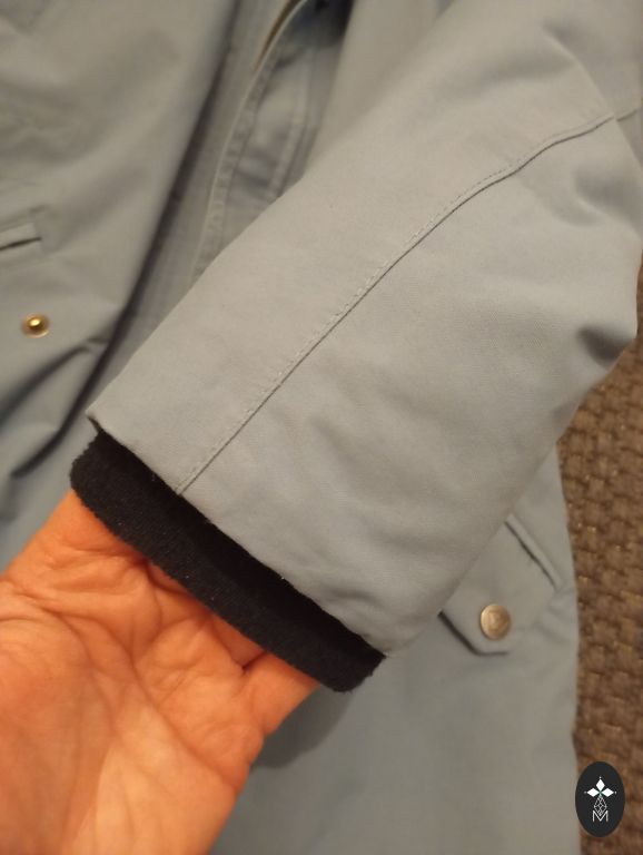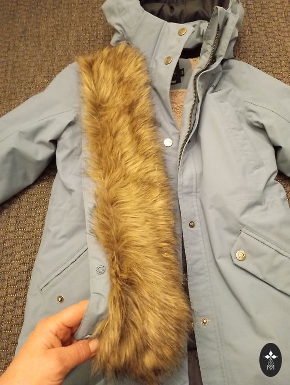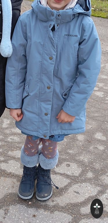 Winter jacket with insulation inside. The material is waterproof and windproof. Many adjustable features, extendable sleeves that will allow the jacket to be worn longer. Labeled size 140, but more like 128-134.