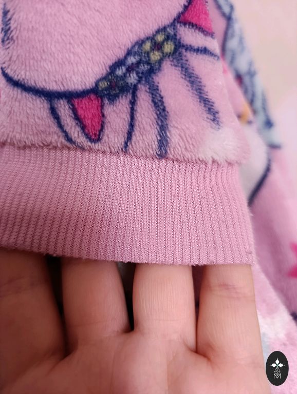 Vienīgais defekts ir pleķis, kas redzams bildē. Tas ir no kumelīšu tējas un ticu, ka pēc pāris māzgasanas reizem izmazgāsies. Meita so komplektu uzvilkta vien kādas divas reizes.