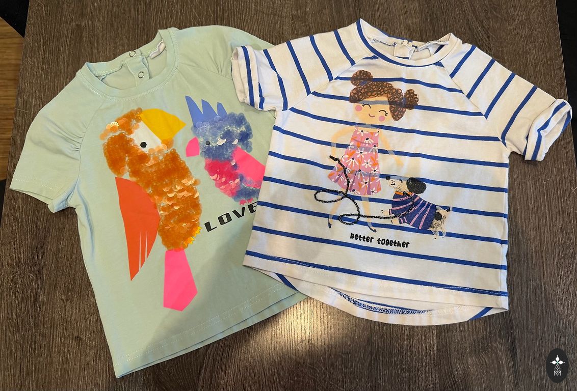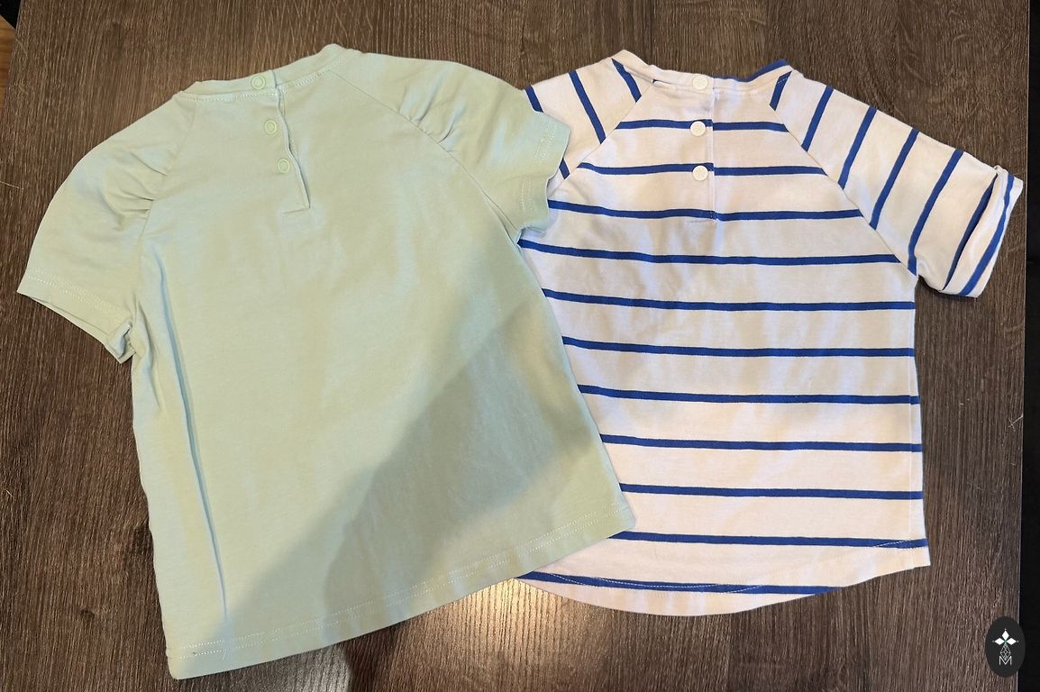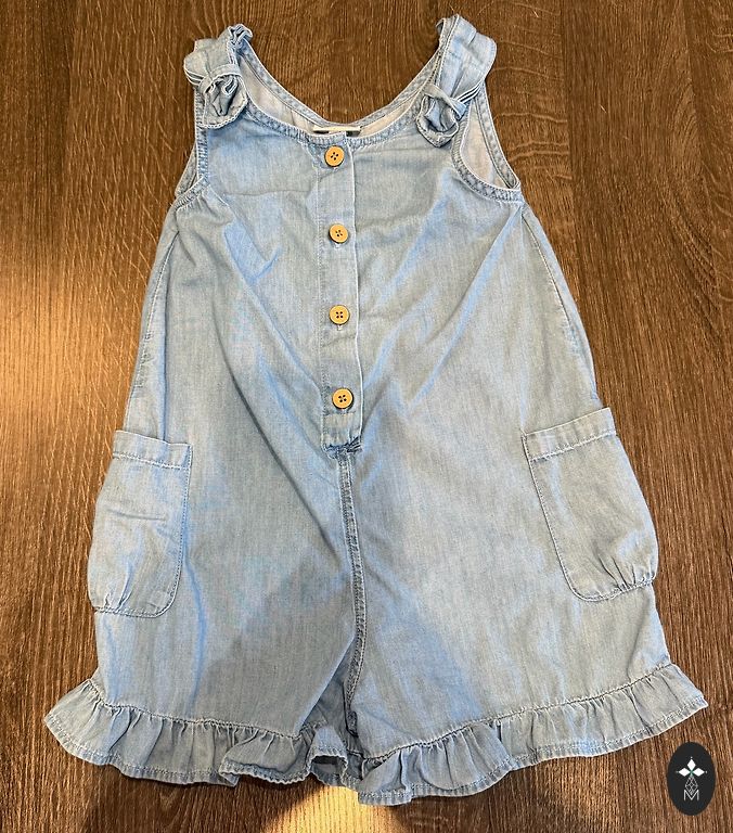 Baltajiem džinsiem (92 - 98 cm) ir defekti (atzīmēti fotoattēlā), taču esmu pārliecināta, ka tos var izmazgāt ar saimniecības ziepēm vai traipu tīrītāju.