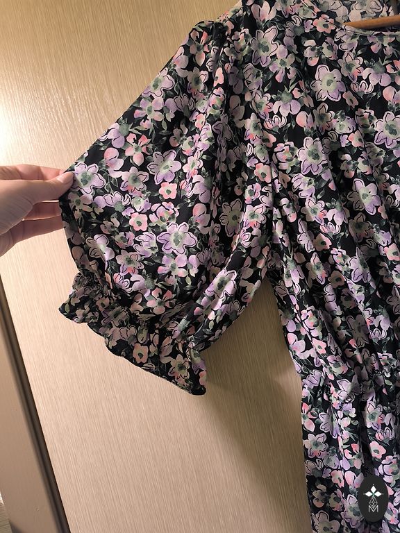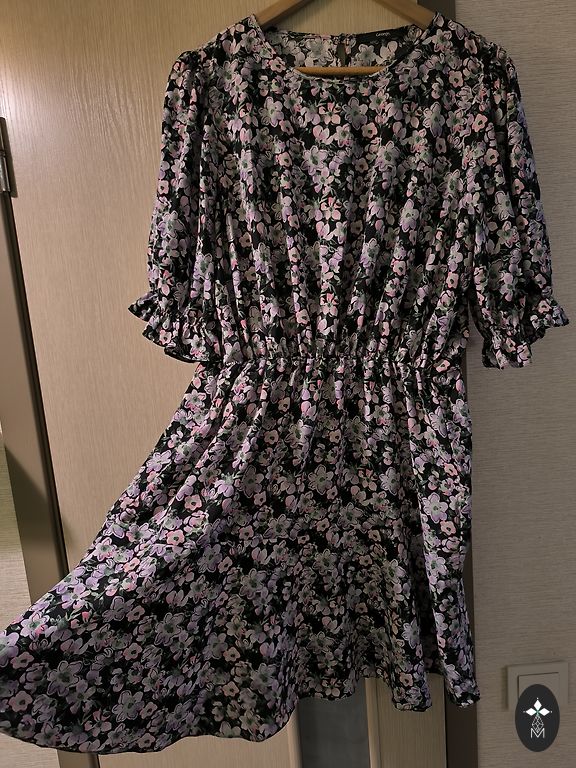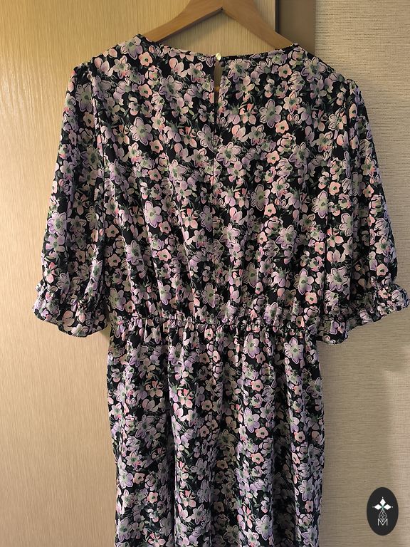 Mini vasarinė suknelė. Trumpa, graži ir spalvinga. Dydis ant drabužio nenurodytas, bet kelis kartus dėvėta M dydžio merginos, kurios ūgis 172. Esminių defektų mano supratimu nėra.