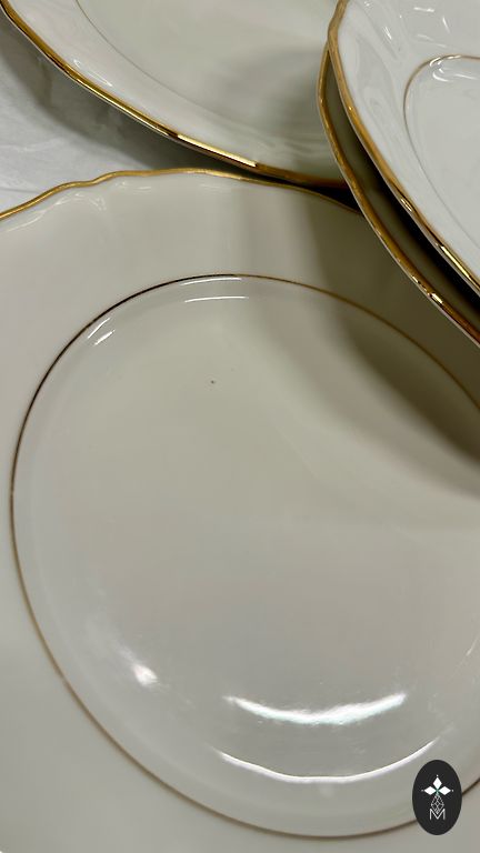 Suurepärane vintage seisukord. Pole pragusid, täkkeid, restaureerimist ega kriimustusi. Kuldne dekoratsioon on suurepäraselt säilinud. Ühel alustassil on näha mõned väga peened täppidena detailid, mis tõenäoliselt tekkisid tootmisprotsessis. Need ei mõjuta välimust ega funktsionaalsust ning annavad esemele individuaalsuse ja autentsuse.