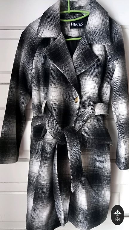 Gražus pilkas spalvos paltas su pamušalu ir kišenėmis.