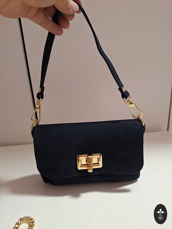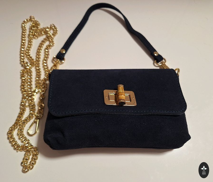Plūmju krāsas somiņa ar violetu īsu un plūmju garu siksniņu. Ir trīs ārējās kabatas un viena iekšējā ar rāvējslēdzi.