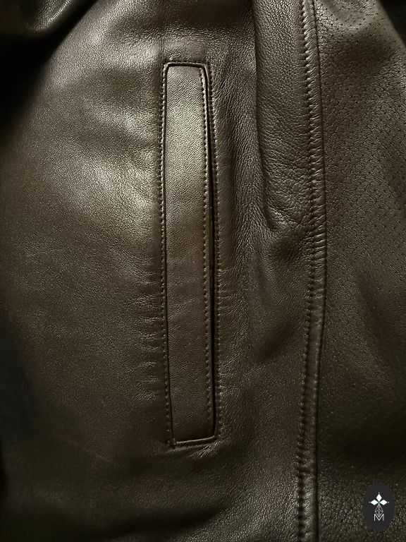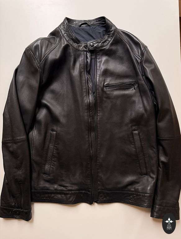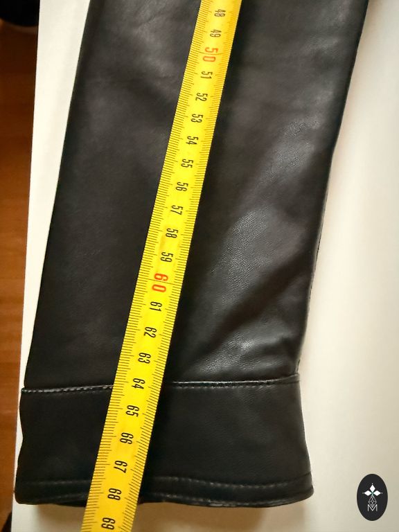 Aksominio audinio (zamšo) motociklininko striukė, XL dydis (draugas dėvėjo L dydį). Striukės ilgis 72 cm, matuojant nuo aukščiausios peties vietos, rankos ilgis 84 cm, įskaitant petį, bet neįskaitant apykaklės.