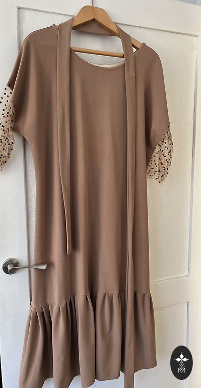 Скажу, что размер больше оверсайз. Свободное, широкое, удобное повседневное короткое платье или скорее туника. Подойдет от M до XXL. Светло-коричневого или капучино цвета. Гофрированная, струящаяся ткань. Надето 1 раз. Без дефектов, в отличном состоянии.