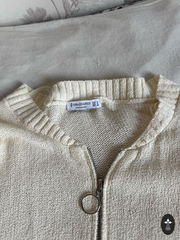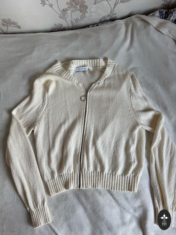 Trikotāžas smalka jaciņa, plecos 38, garums 59, piedurkne no pleca 62, apkārtmērs zem padusēm 94.