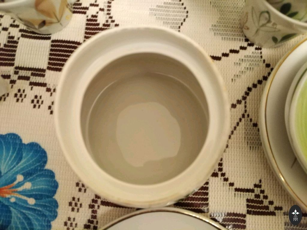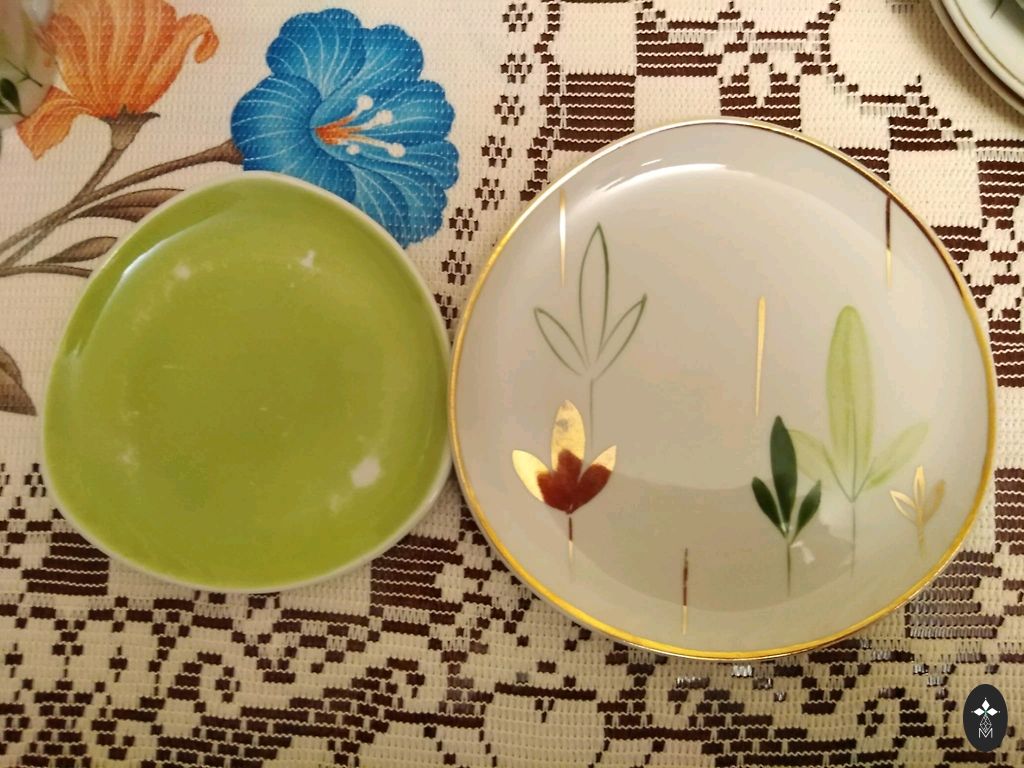 Kuld ja käe maalimine on väga hea. Kaane peal on mini tootmisjälg, vaevumärgatav (viimane foto vaata kell 11), glasuuris väike defekt (eelviimane foto). Kaane peal on mikro tolmuosakesed glasuuris, ei õnnestu pildistada, et näha. Aga üldiselt kena anum.