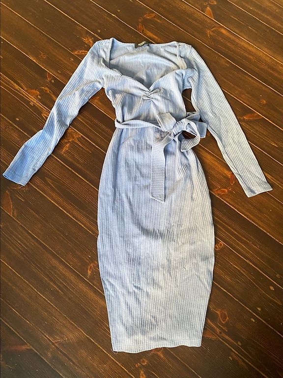 Beautiful festive dress, possibly suitable for a wedding, beautifully white. Worn once to a Christmas party. It has darts for the stomach. Fits beautifully, the ribbon can be tied, tied forward or tied backward. Midi length, up to the knee.