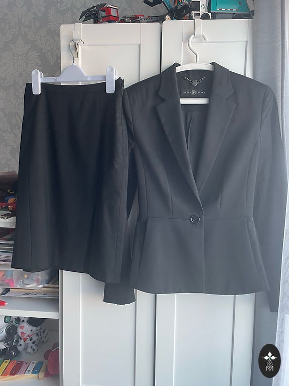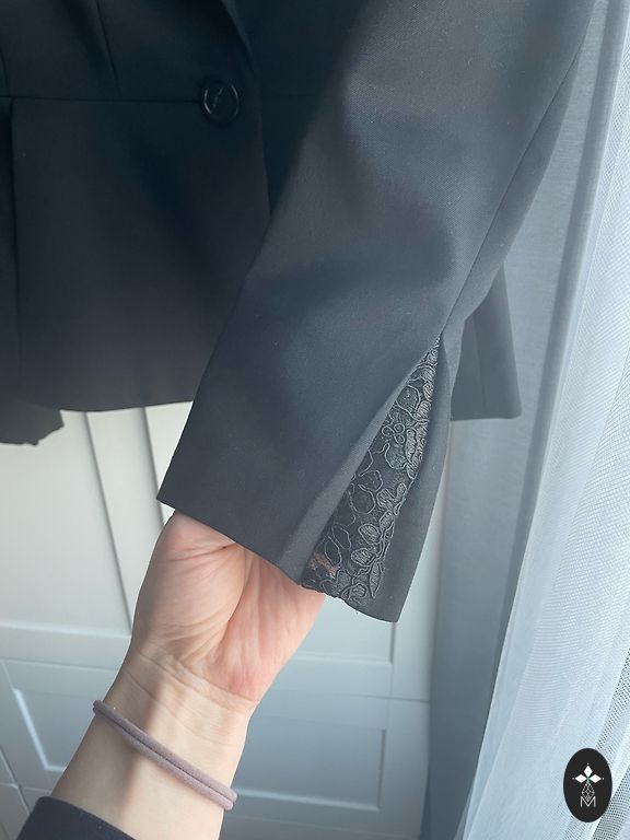 Как новый! Можно носить на работу, можно на мероприятие, выглядит на фигуре очень красиво. К сожалению, мне больше не подходит. У кружевной блузки пуговицы на спине, снизу можно надеть серый топ.