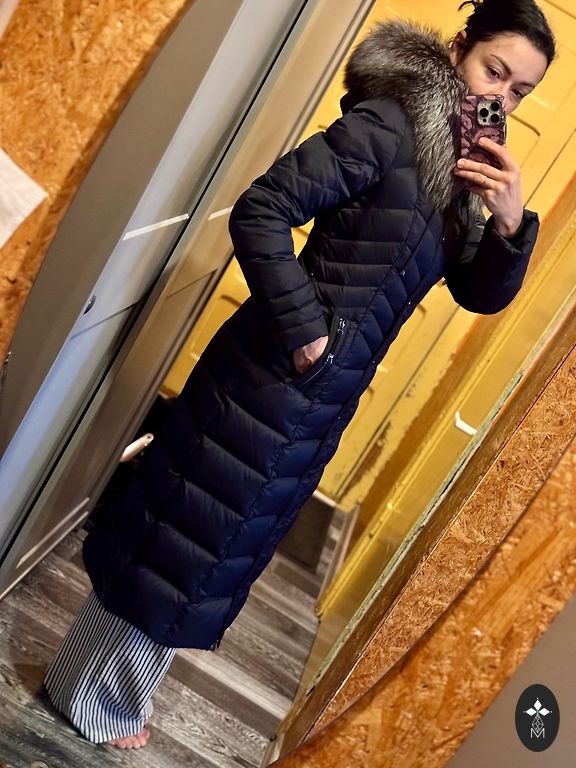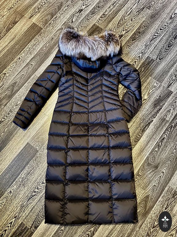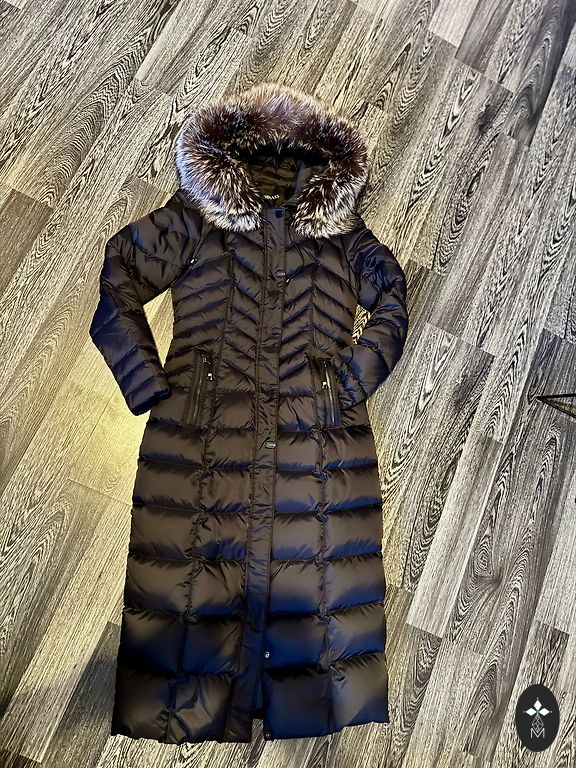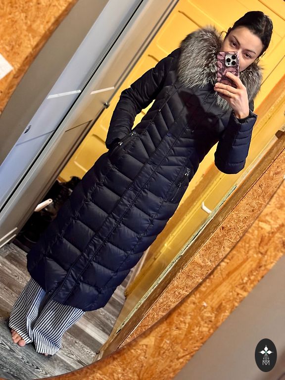 Selling a women's coat, size XS. In good condition, but there is a small hole at the back. Wool and down coat with a combined design, warm filling made from natural duck down. Detachable hood with snap buttons.
