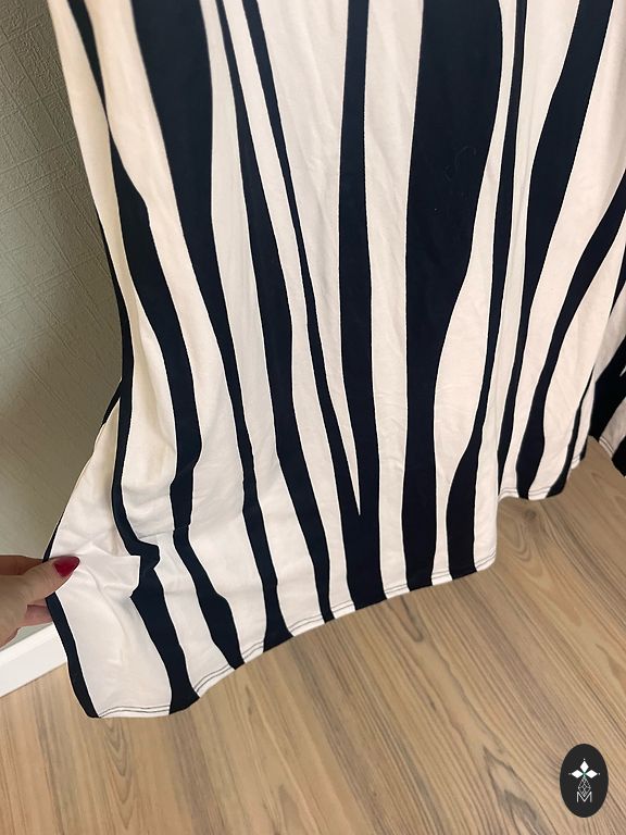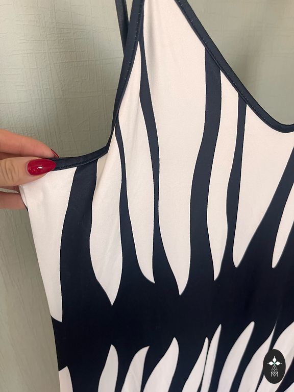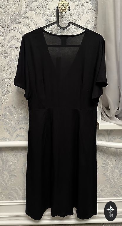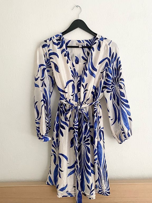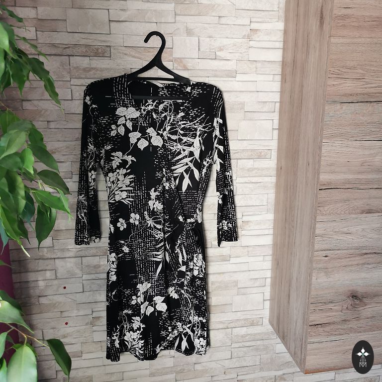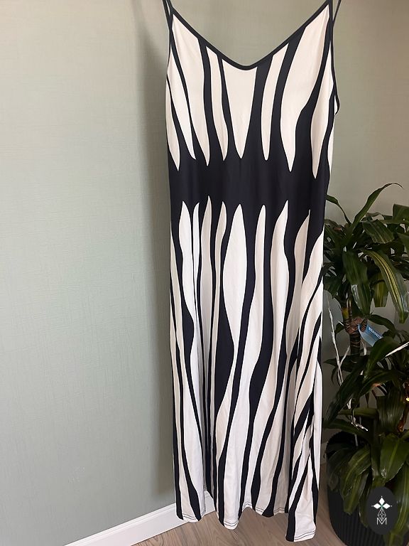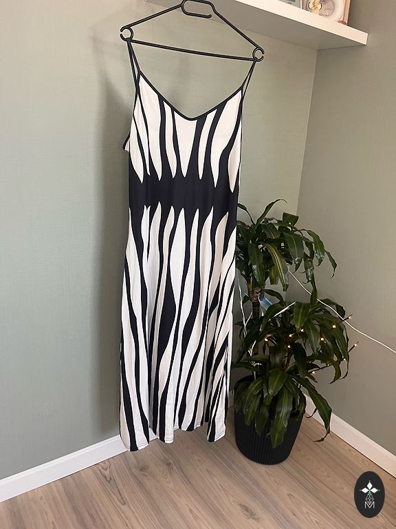 Lindex suknelė. Nauja. 40 dydis, UK 14. Gražus akcentas priekyje, susirišamas. Krūtinės srityje užsegama kabliukais, apačioje su sagomis. Plotis pažastyse 52cm, plotis ties juosmeniu 41cm, ilgis 137cm.