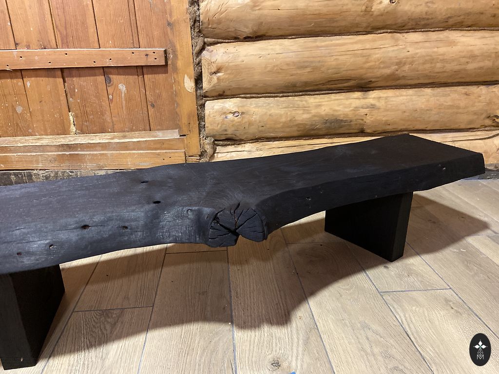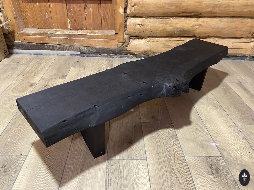 Roku darbs wabi-sabi stilā. Dabiska forma, saglabāta koka faktūra un plaisas. Dedzināts ozols, pārklāts ar cietvaska eļļu.