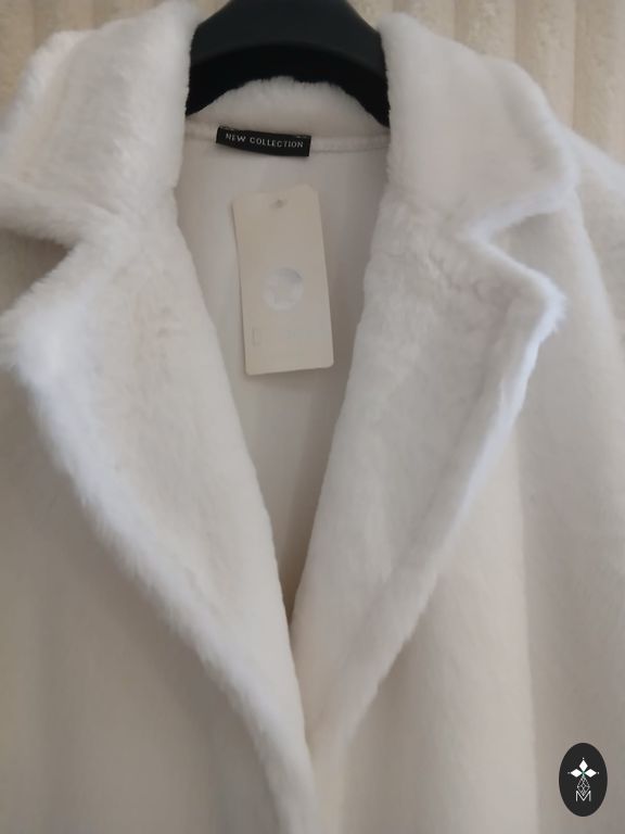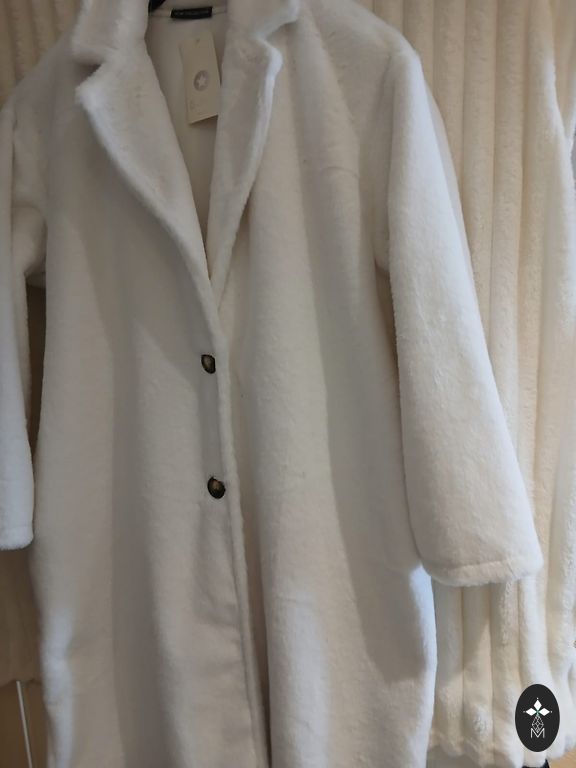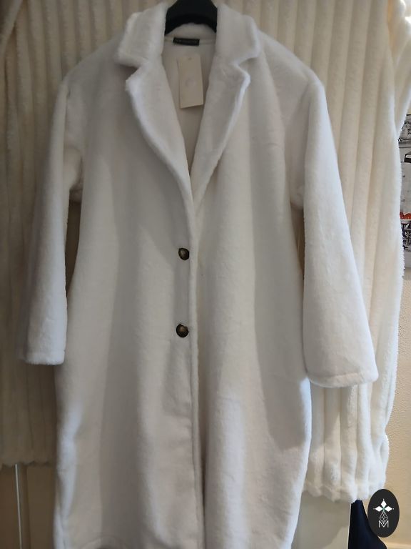 Stilingas moteriškas paltas, juodas, 70% vilna, ilgis 101 cm, krūtinė 110 cm, klubai 112 cm, rankovės 59 cm, pečiai 49 cm. Paltas turi skeltukus šonuose.
