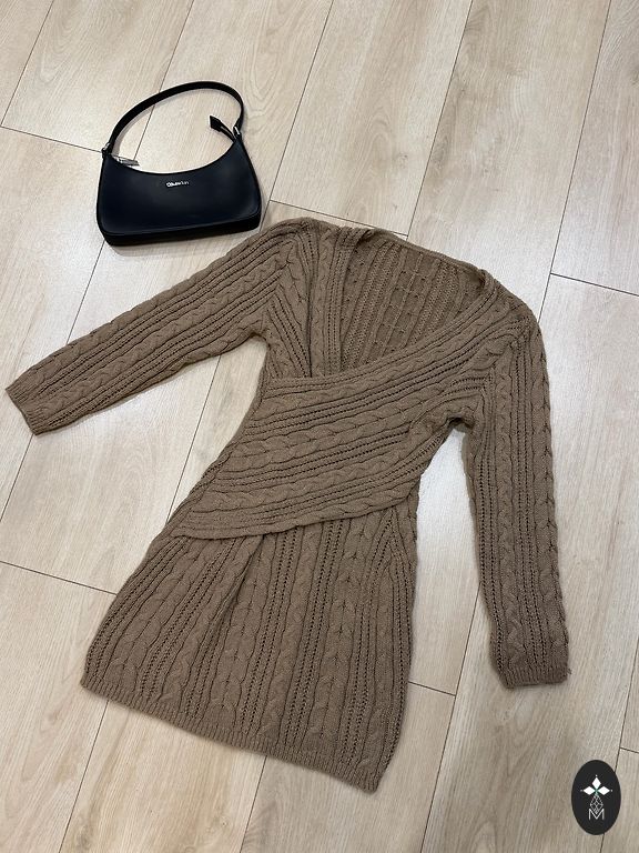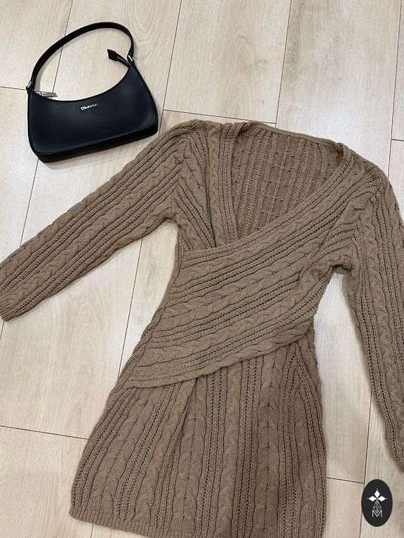 Тёплое элегантное женское платье от бренда MODA INTERNATIONAL. Выполнено из смеси акрила и шерсти, с высоким воротником и сложным диагональным узором по всей длине. Приталенный силуэт, длинные рукава, идеально для прохладной погоды. Цвет — холодный серый с оттенком стали. Размер на бирке — M, но фактически подойдёт на S.// Silta eleganta sieviešu kleita no zīmola MODA INTERNATIONAL. Izgatavota no vilnas un akrila maisījuma, ar augstu rievotu apkakli un sarežģītu diagonālu pinumu rakstu visā kleitas garumā. Pieguļošs siluets, garas piedurknes, piemērota vēsākam laikam. Krāsa — pelēka ar aukstu, tērauda nokrāsu. Lai gan uz birkas norādīts izmērs M, kleita derēs arī S izmēram.