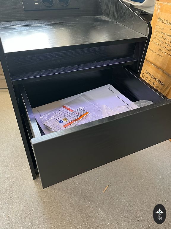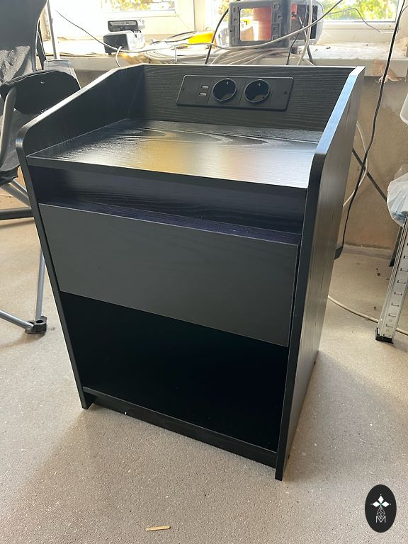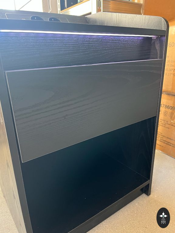 Naktiniai staleliai su elektros lizdais, USB ir type C įkrovikliu. Staleliai turi stiklo paviršius, LED šviesas, šviesos turi keičiamas spalvas ir mirksėjimo funkciją. Šviesas galima reguliuoti mygtuku prie stalelio arba telefono programėle. Viršutiniame stalčiuje yra daiktų organizatorius.