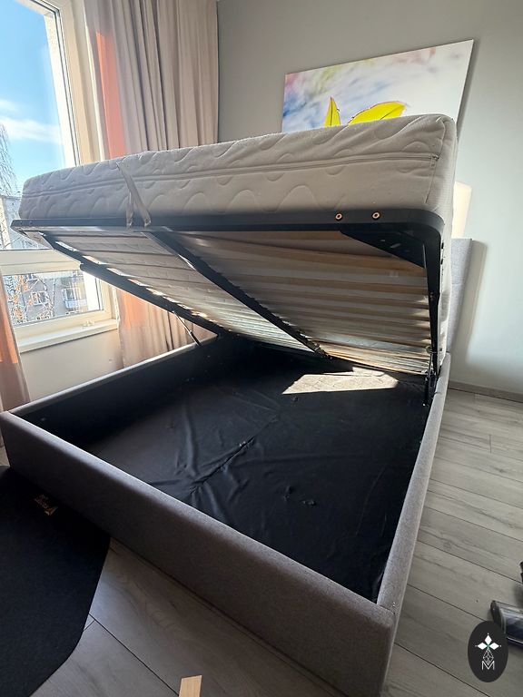 Gray (good fabric doesn't pill) small pull-out sofa bed. Sleeping dimensions 120x200, assembled 94 (including the whole assembly) x153 cm. Seating depth 62, seating height 37 cm. Self-pickup at Katrinas dam, convenient access. No cat has been present 😂