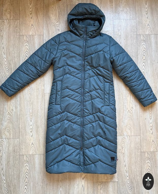 Stāvoklis un īpašības- Ļoti labs, minimāli lietots. Nav defektu, tīrs. Silts, viegls, kvalitatīvs pildījums. Noņemama dabīgas kamieļkažokādas apkakle. Divas kabatas ar rāvējslēdzi. Slīpās šuvju līnijas vizuāli slaidina augumu.