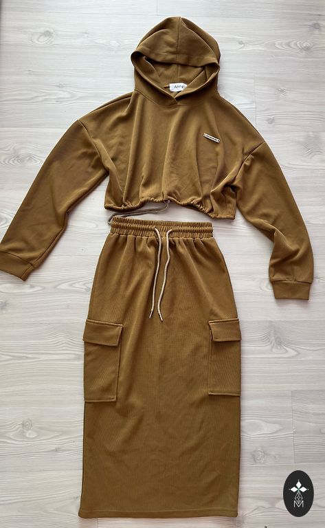 New costume dress with a cardigan. Fabric is thick, warm, heavy knit. Straight sleeveless dress with a high collar. Loose cardigan with buttons. The set is new, with a tag. Ideal for size M, too loose for size S.