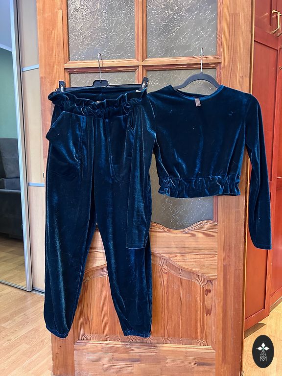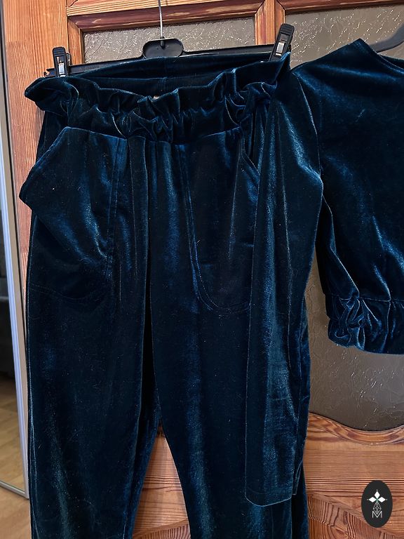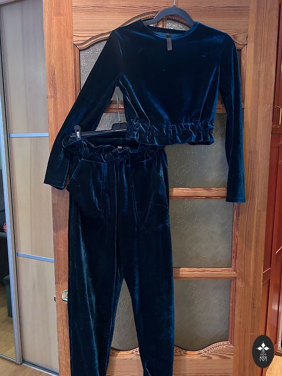A set of skirt with sweater. Very beautiful deep turquoise green color. The fabric is thick, warm, with lurex. Pencil skirt with elastic, loose sweater, interesting cut. Suitable for size S-M. In excellent condition, worn once. Shipping included in the price.