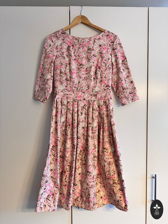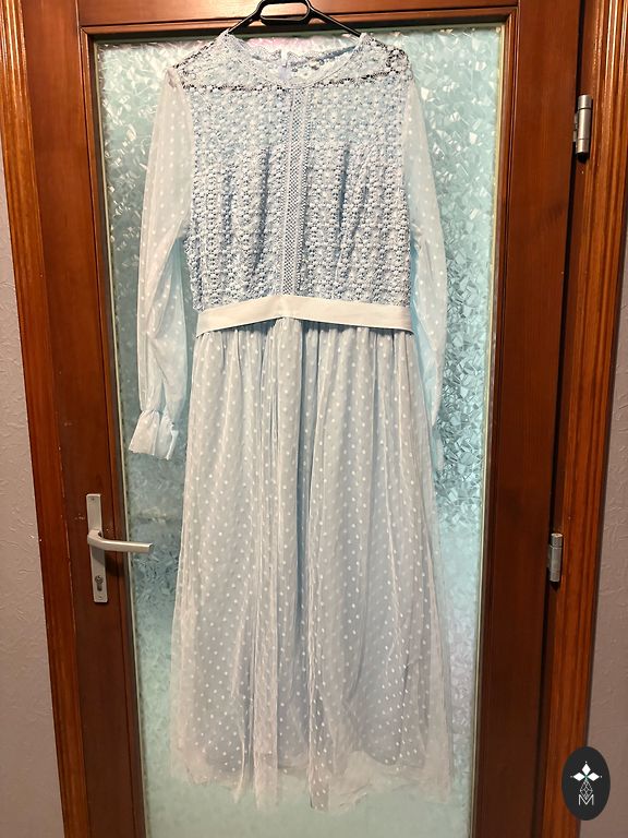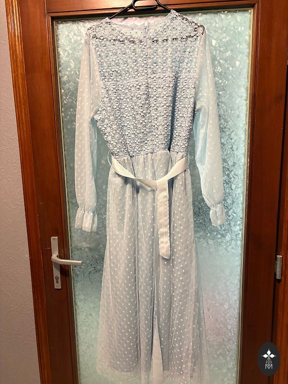Kelios kartus dėvėta, geros būklės. Spalva - seniai rožinė. Ant kūno atrodo labai gerai, laisvai krenta, o nėriniuota sijono dalis labai graži. Suknelės ilgis 98 cm, dydis 40. Rankų dalis tik iš nėrinių, o apačioje taip pat yra apie 10 cm tik nėrinių. Deja, nuotrauka negali perteikti suknelės grožio.