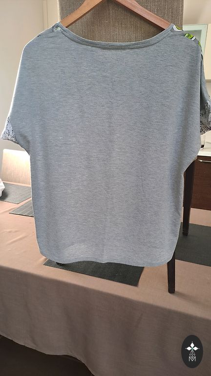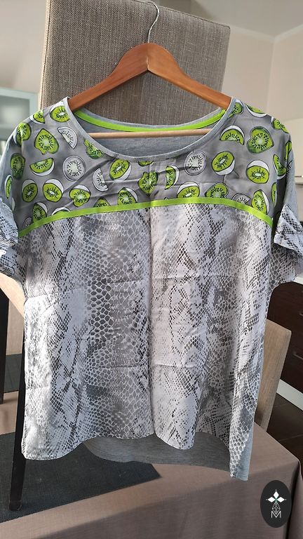 Graži žalia polo marškinėliai. Du išsiuvinėti elementai priekyje ir didelis skaičius 2 gale.