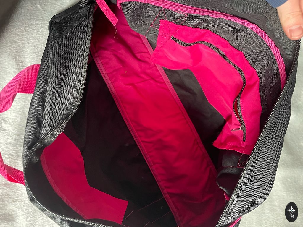 See seljakott on must erksate roosade ja violetsete triibuliste mustritega. Sellel on mugavuse tagamiseks polsterdatud rihmad ja seljaosa ning küljevõrguga tasku. 😆