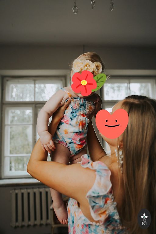 Bodija izmērs meitenei 12–18 mēneši (aptuveni 86–92). Kleitas izmērs mammai — L–XL. Stāvoklis ideāls.