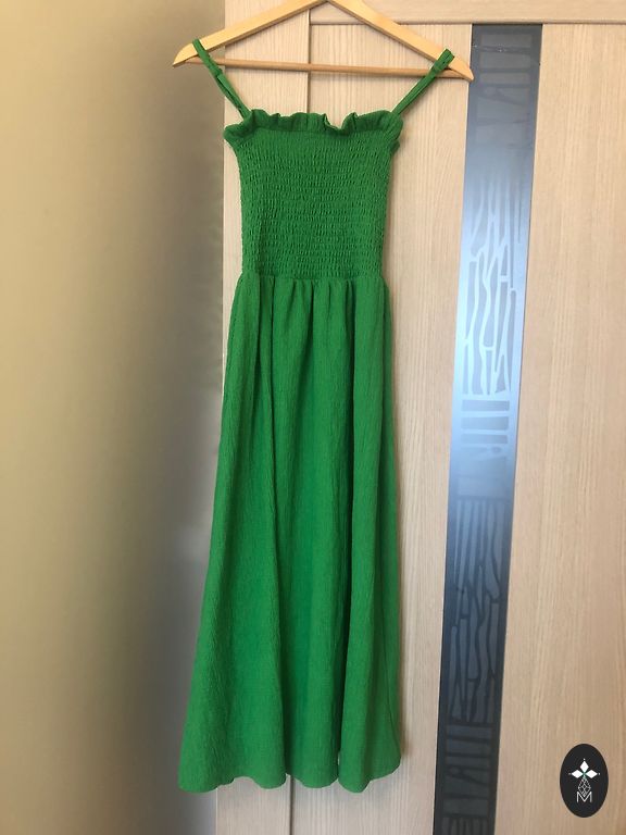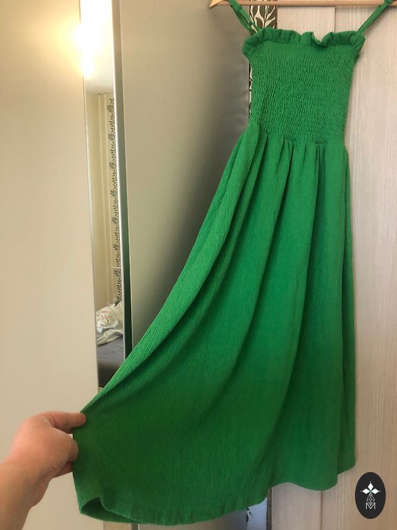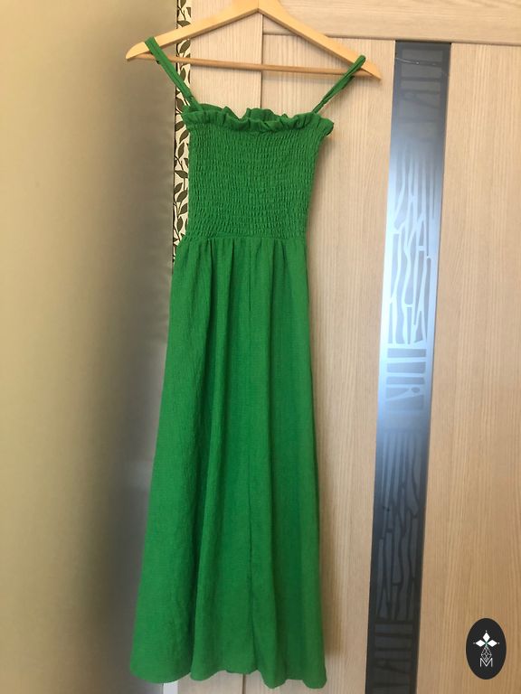 Ilgis nuo peties apie 129 cm. Nuo pažasties iki pažasties maksimaliai 43*2, mažiau, žinoma, geriau. Suknelė be pamušalo, šiek tiek permatoma. Ilga vasarinė suknelė tamsiai žalios arba smaragdinės spalvos su dideliu baltų gėlių raštu. Modelis turi stovinčią apykaklę, raištelius ant kaklo ir sijoną su raukiniais. Sodrus žalias tonas su kontrastingais baltais gėliais suknelę paverčia ryškiu akcentu. Didelis gėlių raštas yra populiarus trendas. Stilius: Maxi ilgis ir A-siluetas su raukiniais sukuria romantišką ir moterišką įvaizdį, kuris nevaržo judesių, išryškina figūrą ir suteikia elegancijos.