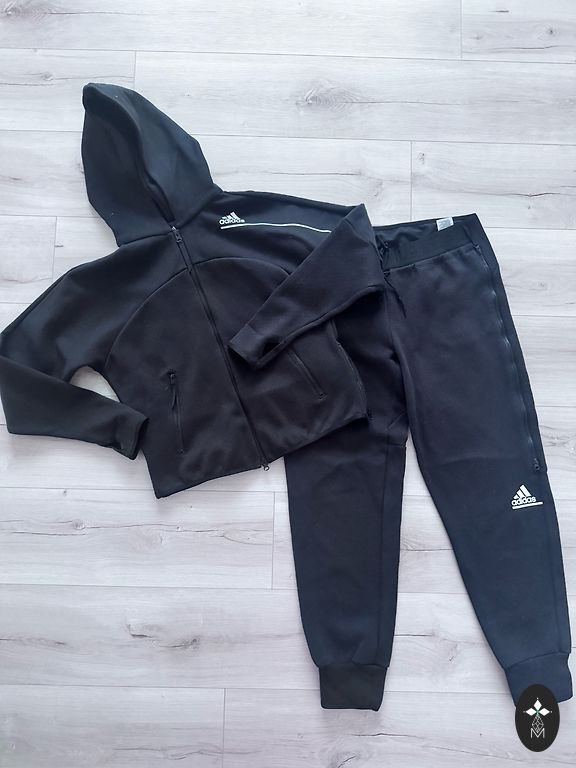 Adidas kostiumas: kelnės su gumine juosmens ir kišenėmis bei megztinis. Idealios būklės, dydis S, kelnių ilgis 96, megztinio ilgis 60, nuo pažasties iki pažasties 50.