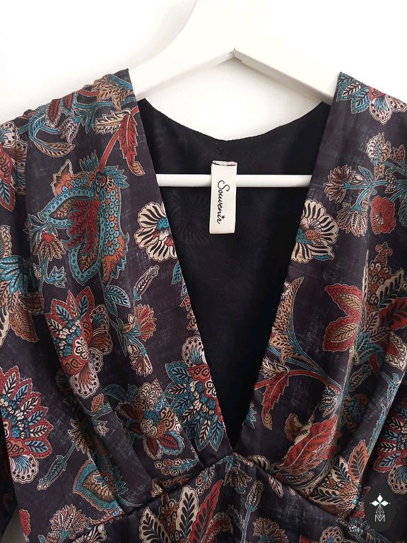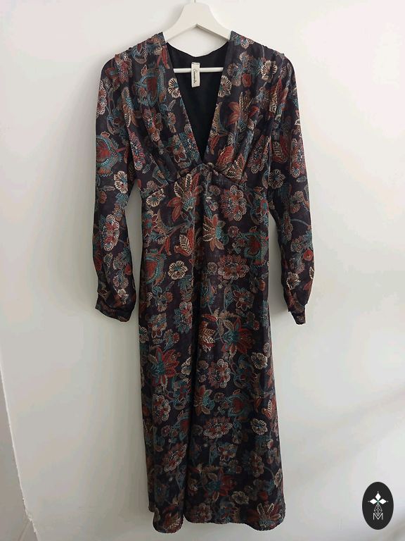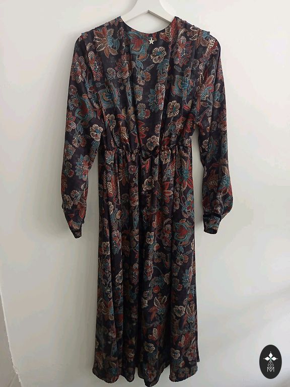 Красивая платье темно-синего цвета с узором. V-образный вырез. Свободный верх и низ, посередине резинка. Рукава свободные с легкой резинкой на концах. С обеих сторон небольшой разрез. Немного использовано, без дефектов. Размер 38. Размеры: длина 126 см, грудь 52 см, длина рукава 45 см, талия