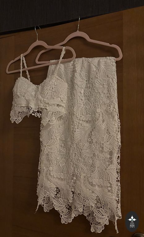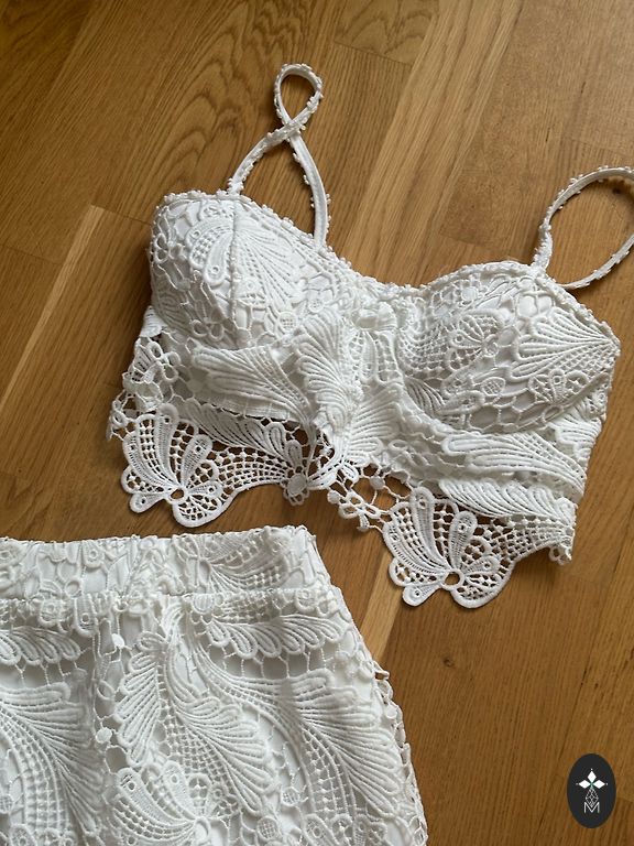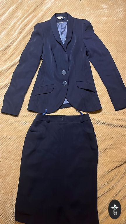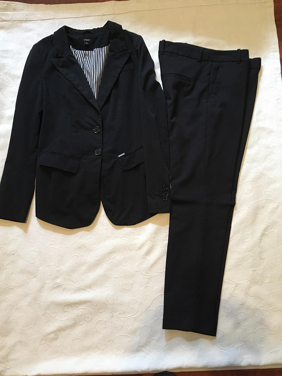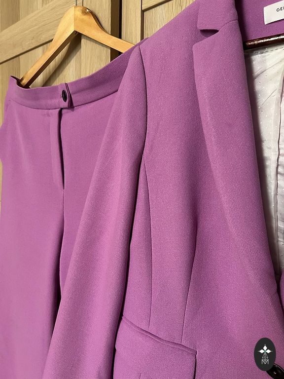 Mazlietots rozā kostīms. Materiāls: 60% poliesters/35% viskoze/5% elastāns. Derēs uz Xs vai 34 izmēru. Žaketes garums 61cm, platums 74cm, pleci 38cm, krūtīs 72cm, piedurknes 59cm. Bikses garums 87cm, viduklis 68cm, gurni 84cm, stara no iekšpuses 65cm.
