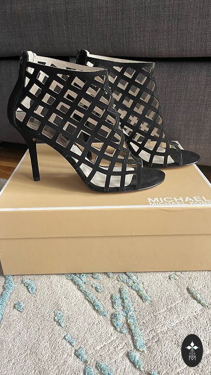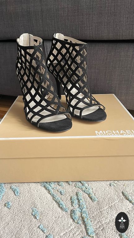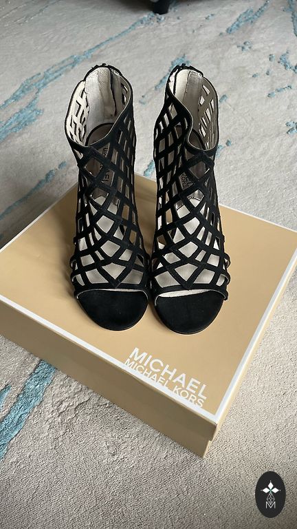 Жесткие туфли из замши с завязывающейся лентой вокруг ноги. Только примерялись, но так и не были надеты. Каблук 9 см. Платформа 1,8 см.