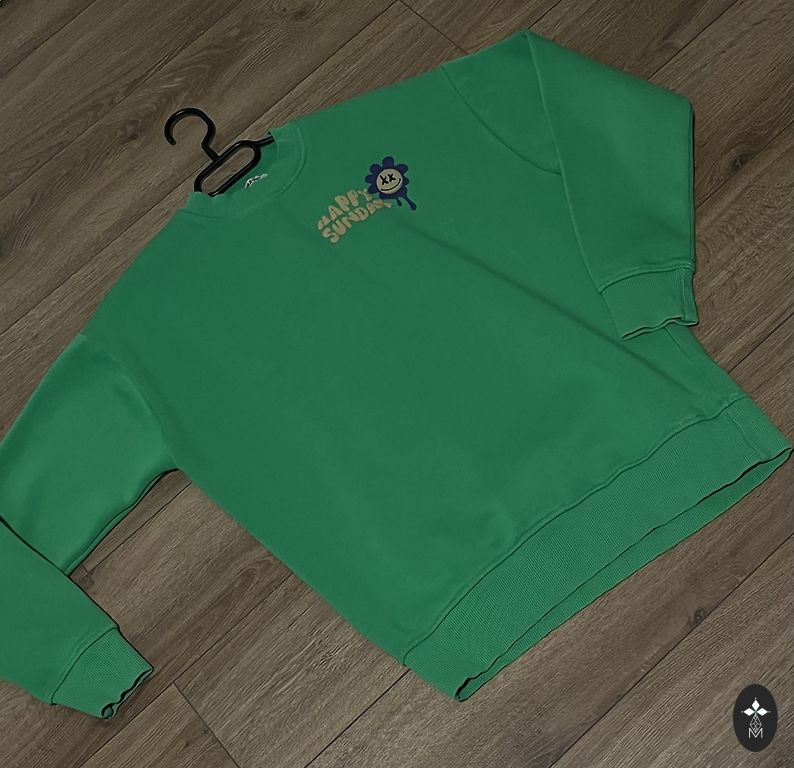 Džemperis ar nelielu spīdumiņu, praktiski jauns, bez lietojuma pazīmēm. Mēri krūtīs 64cm x2, garums priekšpuse 70cm, mugurpusē 78cm, piedurkne pie pleca 17cm x2.