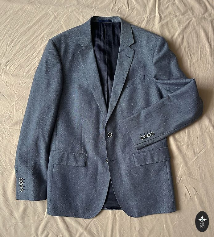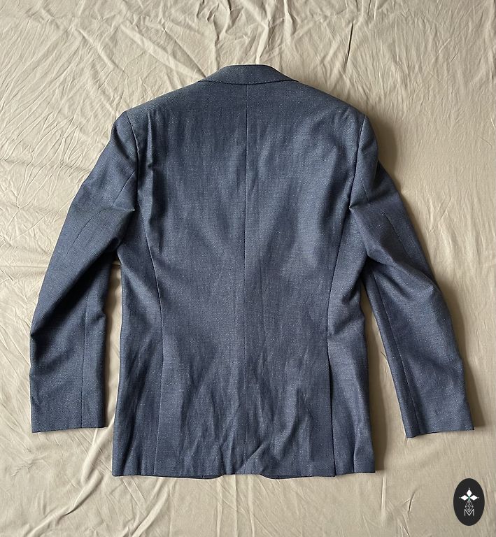 Tumši zila auduma vīriešu žakete, garums 71 cm, plecu platums 48cm.