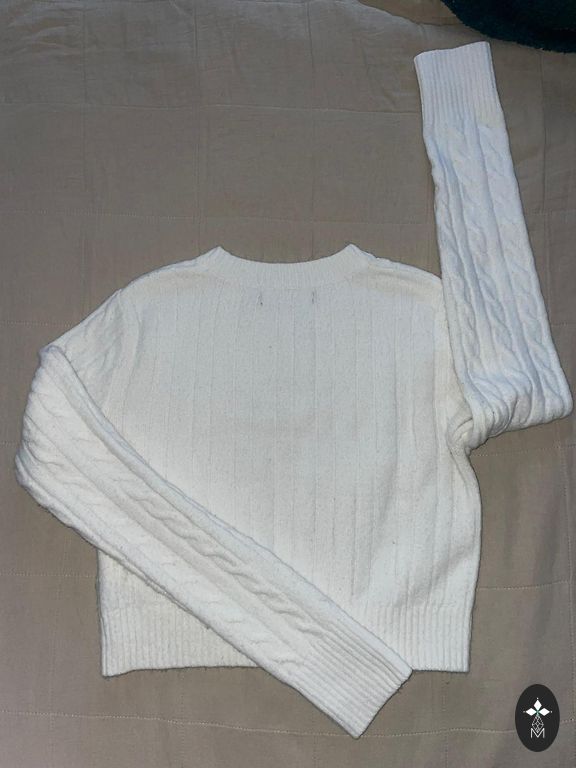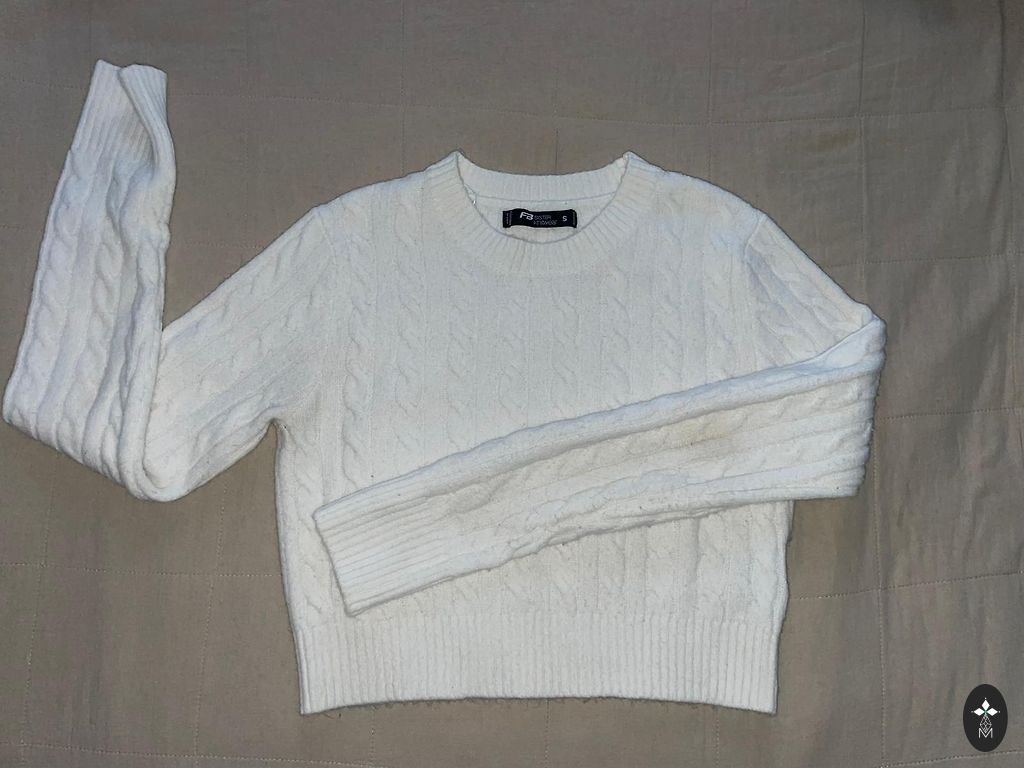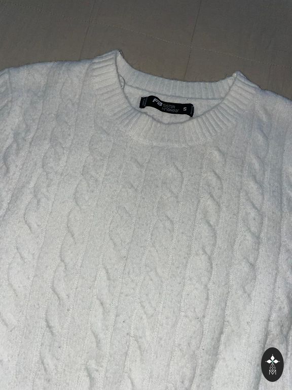 Pilka, S dydis, ilgos rankovės, šiek tiek altas. Sudėtis 54% poliesteris, 41% akrilas, 5% vilna