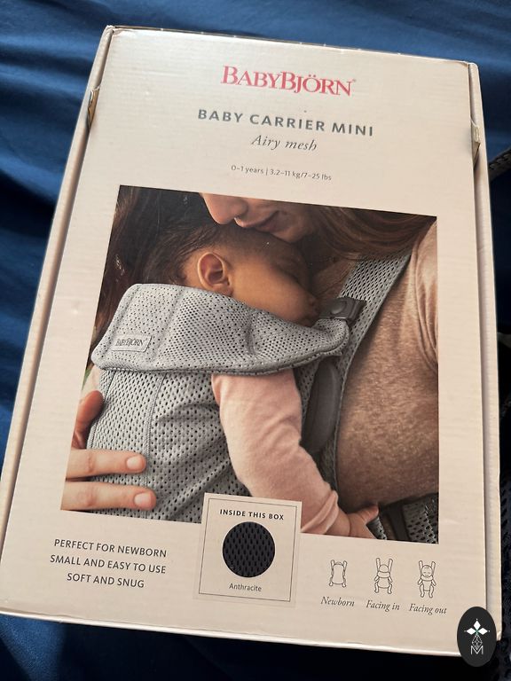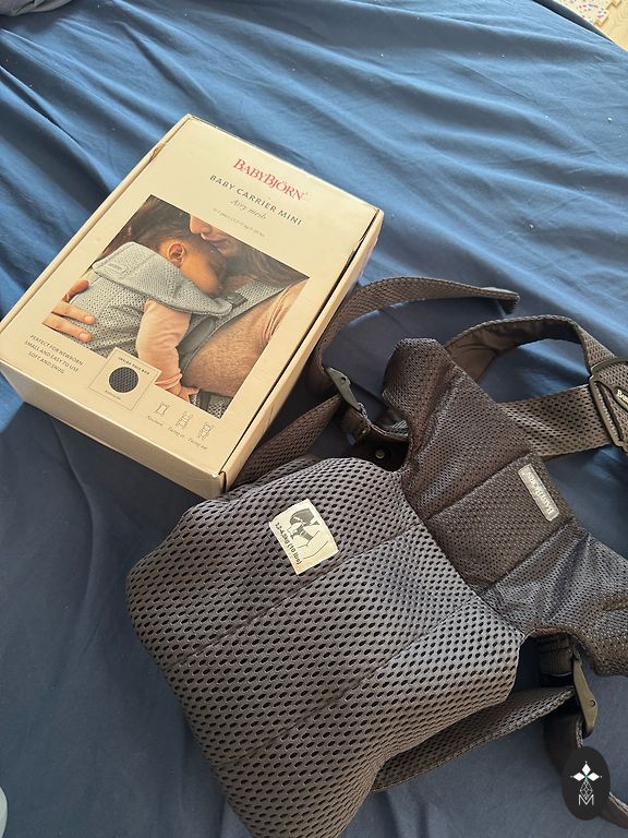 BabyBjorn kott, mis on mõeldud 3,5 kg kuni 15 kg. Saab panna kõhule ja seljale. Rihmad on reguleeritavad. Seespool on kangas pleekinud kohas, kus koti äär on kokku volditud. Lihtne peale panna ja last sisse/välja võtta.