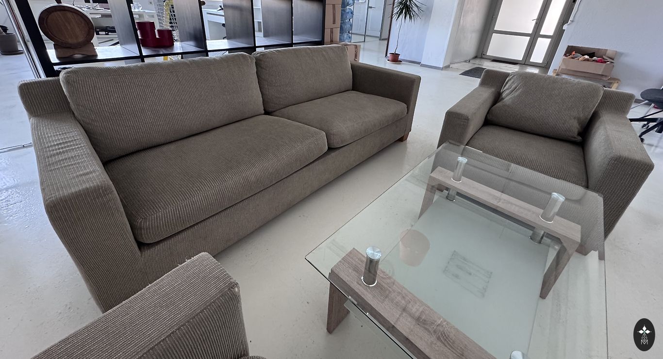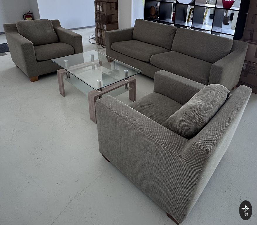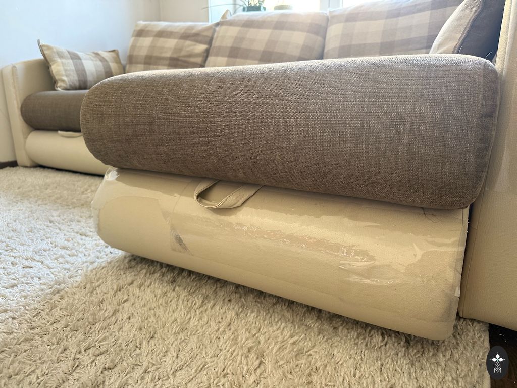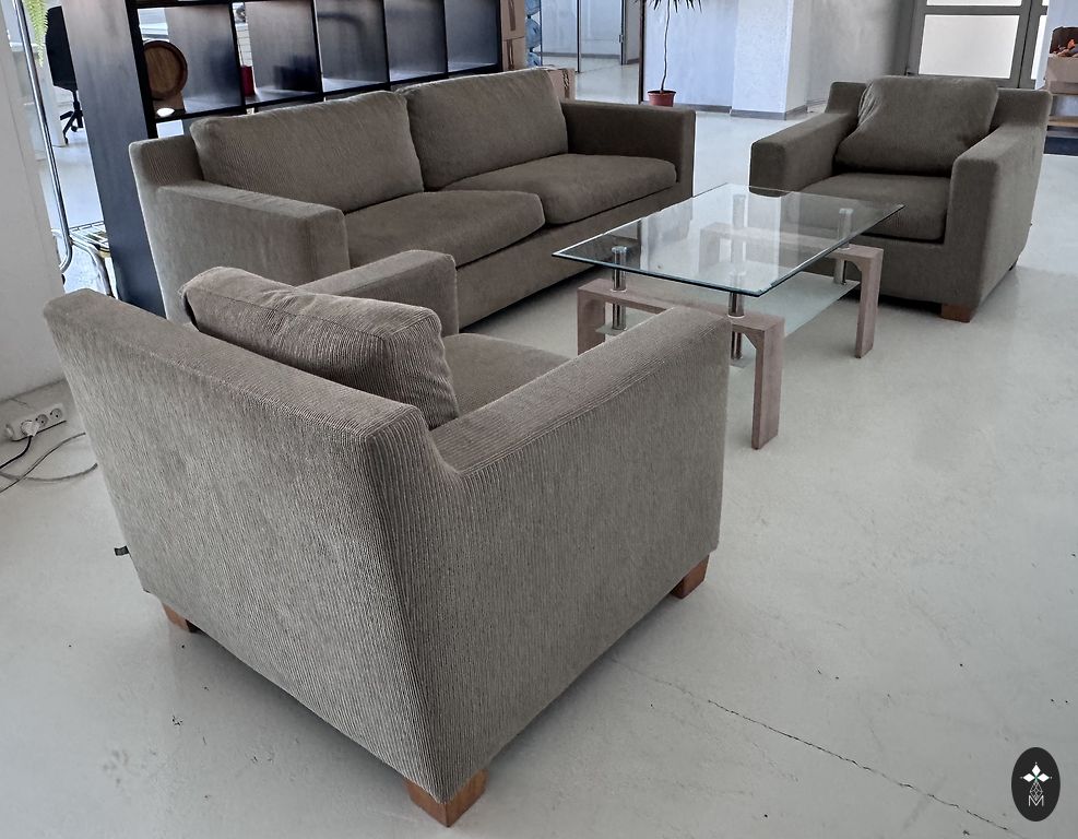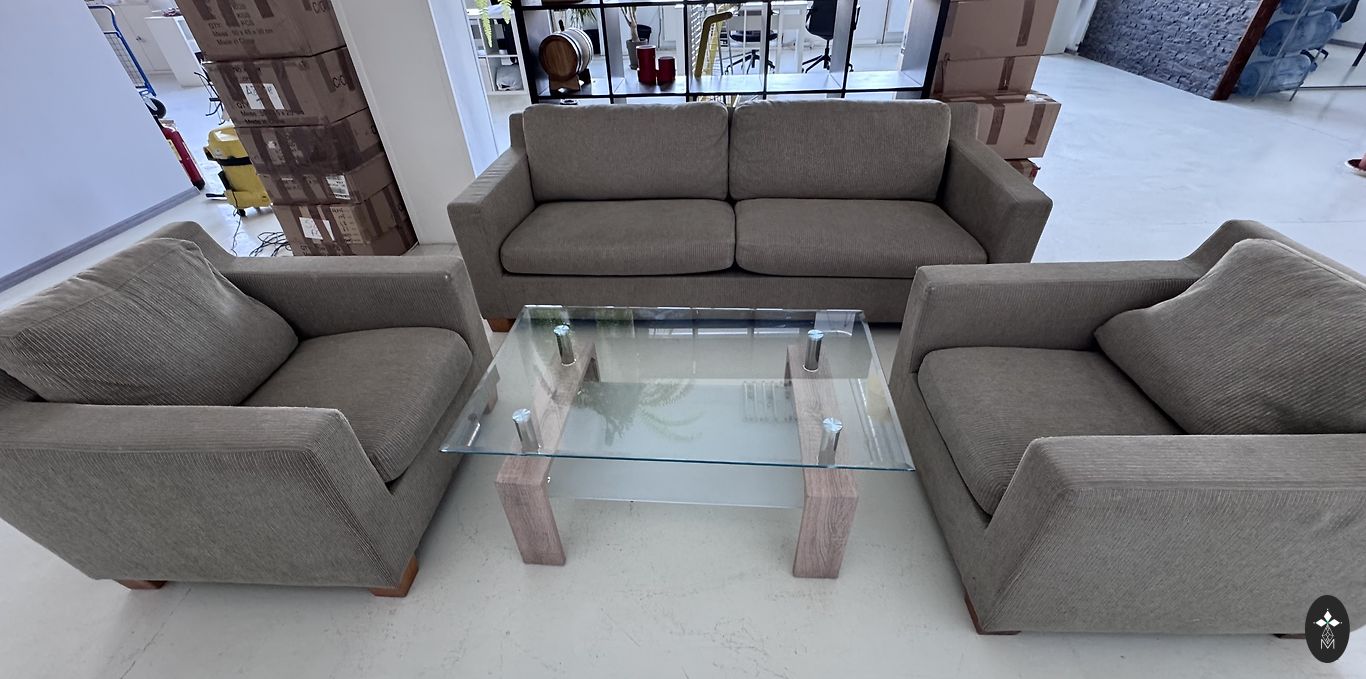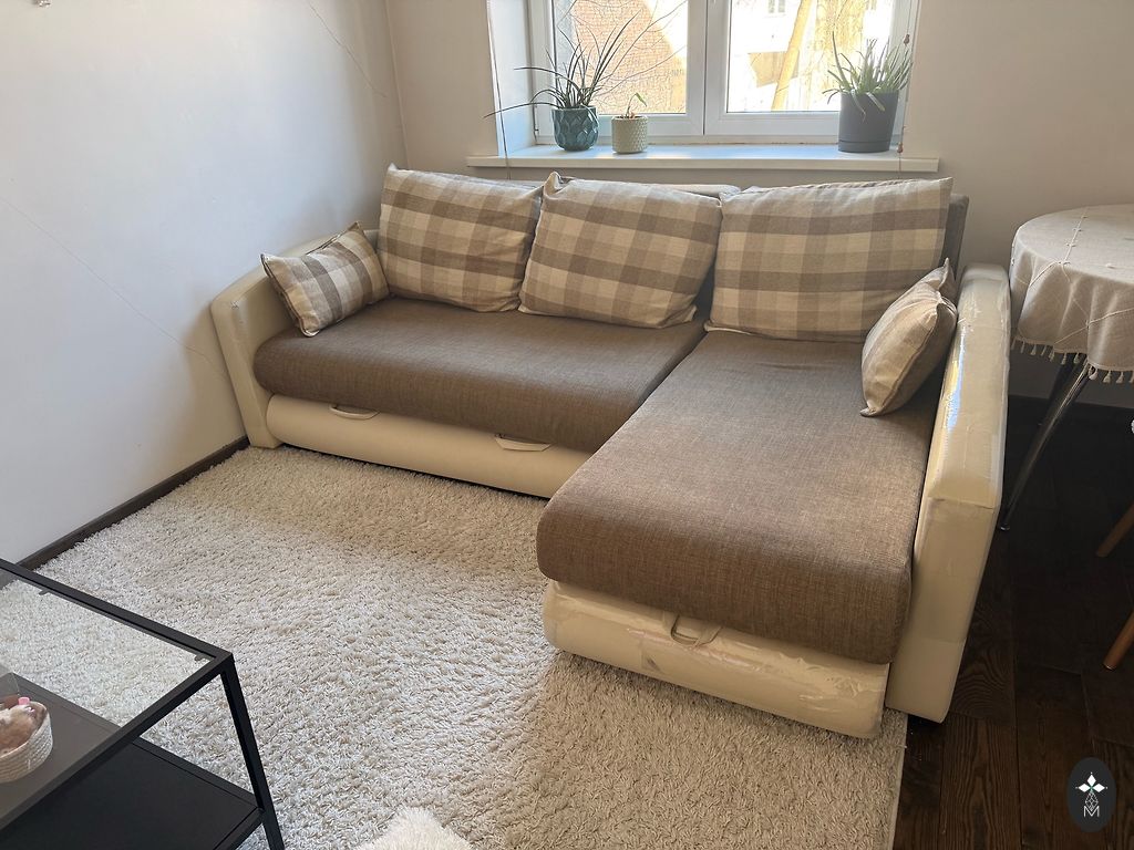 Komplektas ištraukiama sofa su kubo kėdėmis.